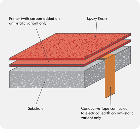 An ESD epoxy system typically consists of multiple layers, including a primer, a conductive base coat, embedded copper grounding strips, and a specialized dissipative topcoat. The copper grounding grid is connected to an approved grounding point, creating a continuous pathway for static energy to discharge safely. The finished surface remains seamless, durable, and easy to clean, while maintaining consistent electrical properties across the entire floor area. Proper installation and testing are critical to ensure the system performs within the required resistance range.
